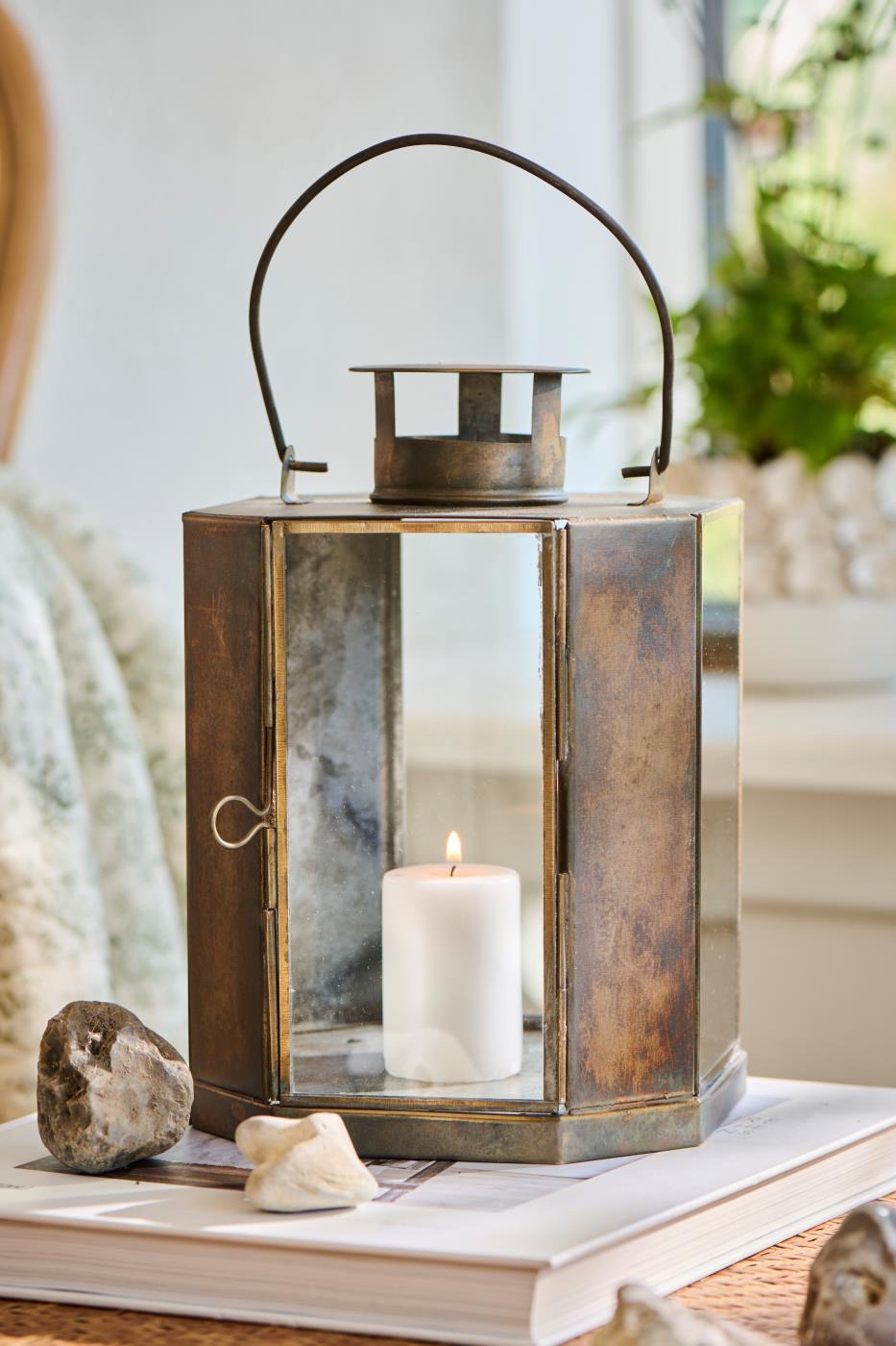 This Large Antique Style Octagon Lantern has a beautiful rustic look with its aged look metal body and clear glass windows. Suitable for indoor or outdoor use.