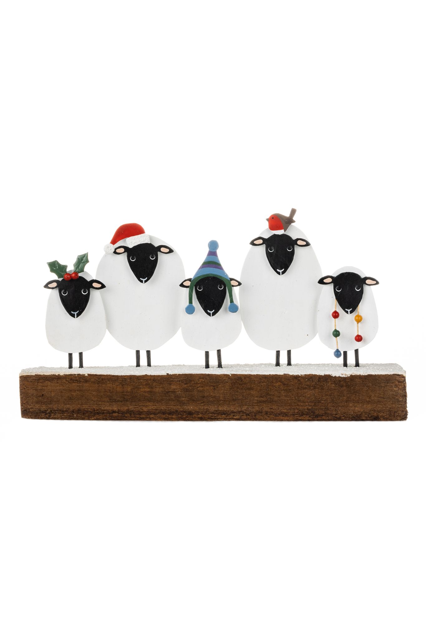 A charming winter scene featuring five metal sheep standing on a snowy wooden block. This delightful Five Christmas Sheep Ornament from Shoeless Joe is perfect for adding countryside character to your festive decor.
