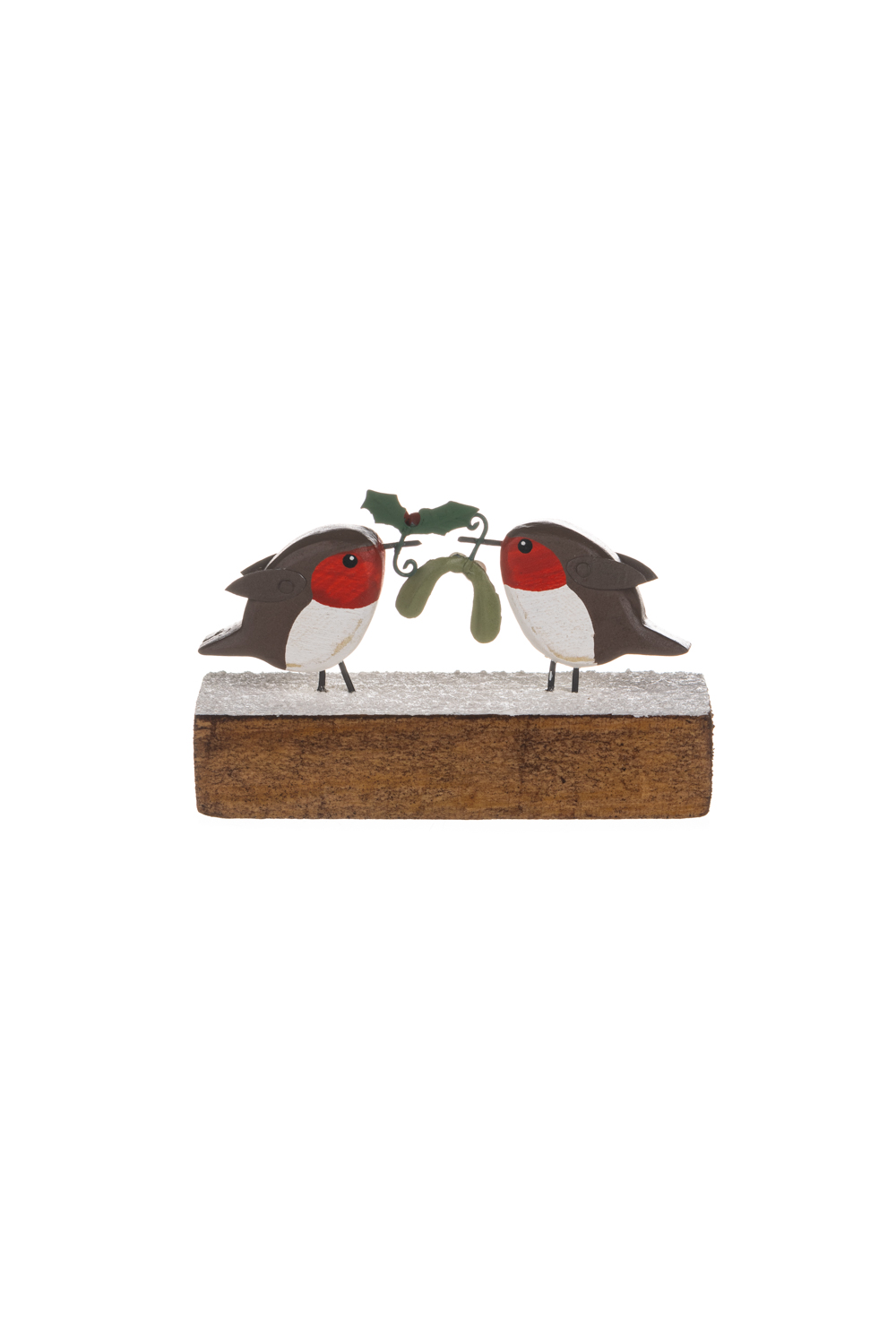 A charming Robins Sharing Mistletoe and Holly featuring two lovebirds on a snow dusted wooden block sharing a mistletoe. A delightful decoration from Shoeless Joe, the perfect romantic decoration for the Christmas season.